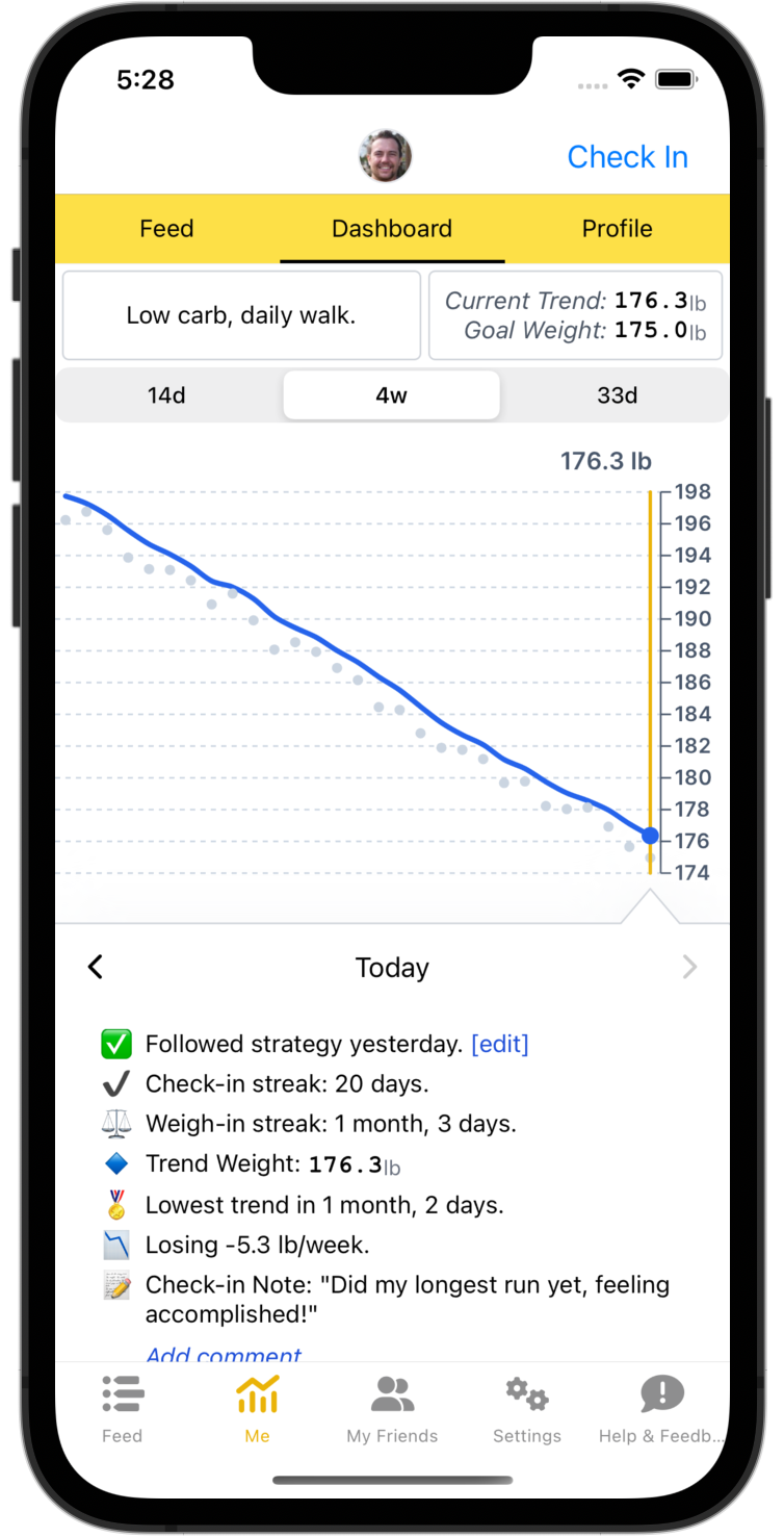Having someone you trust look at your weight has a profound psychological effect. The more other people are watching your weight graph, the more it will tend toward your goal weight. Anecdotally, this seems to work among the early users who are brave enough to share their weight graph with someone else.